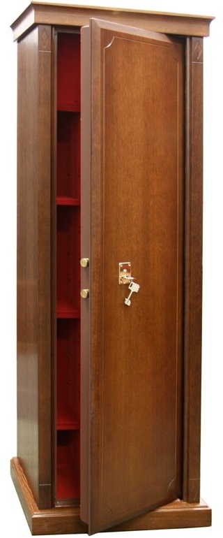 — Внутренняя отделка – эффектный красный бархат, успешно оберегающий оружие от царапин. Снаружи – декоративная отделка натуральным деревом и шпоном дуба.
