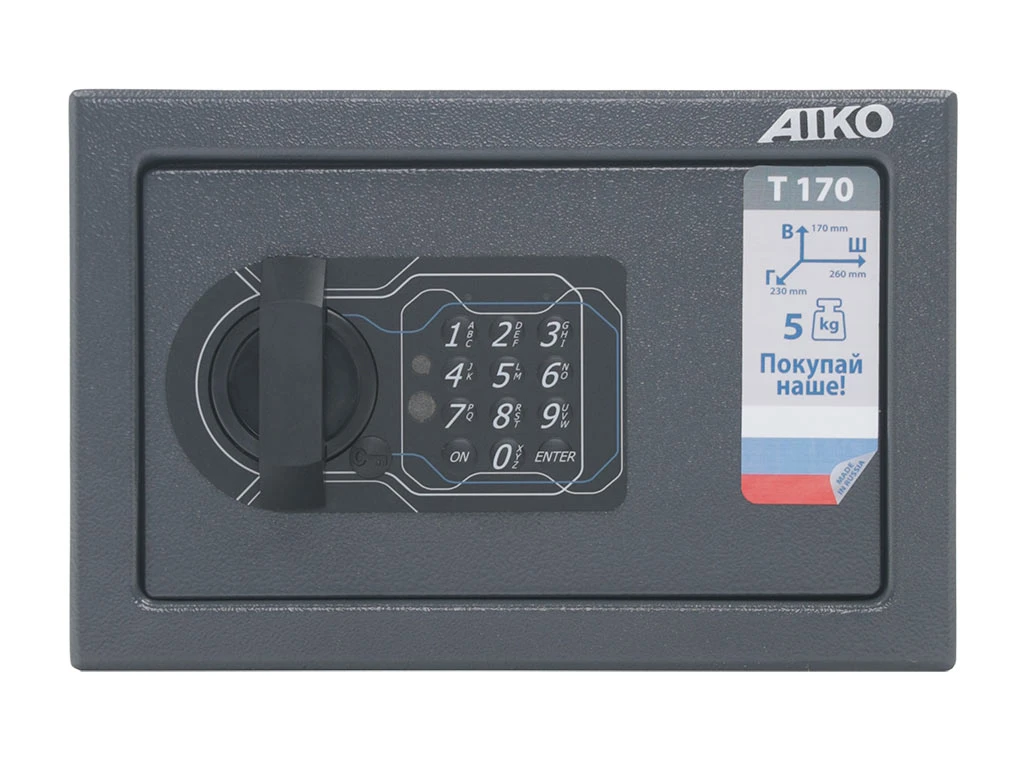 - — Офисный сейф Aiko T-170 EL имеет сертификат соответствия стандартам ГОСТ на начальную устойчивость ко взлому и соответствует требованиям МВД РФ к хранению огнестрельного оружия.
